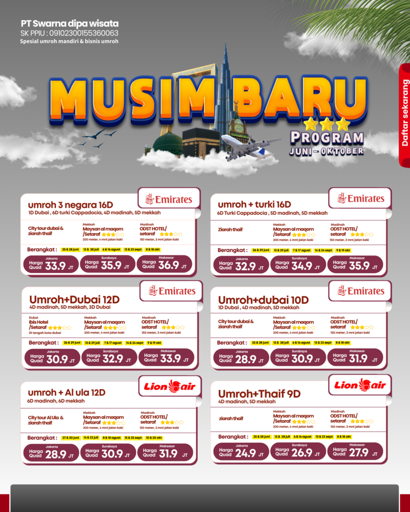 Umroh Mandiri merupakan suatu program untuk membantu kamu agar bisa umroh dengan budget terbatas, namun tetap bisa beribadah dengan nyaman. Cukup cari dan beli tiket pesawat susuai tanggal keinginanmu dan sisa nya serahkan sama Nur azma travel untuk membantu mu!